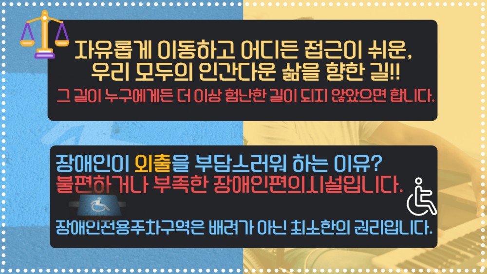 페이지 정보 작성자 제갈동근 댓글 0건 조회 2,080회 작성일 21-12-14 11:29 목록 게시판 추가옵션 수정 삭제 본문 복지 정보 장애인인권캠페인 이동권에 대하여 장애인인권캠페인 첫번째 오늘의 주제는 '장애인의 이동 및 시설접근권' 에 대하여 이야기해 봅니다. 이전글내년 장애인고용 예산 7663억 어떻게 쓰이나 21.12.22 다음글정신장애인 탈수용화 선행돼야 할 방안 21.12.08 목록 글수정 글삭제
