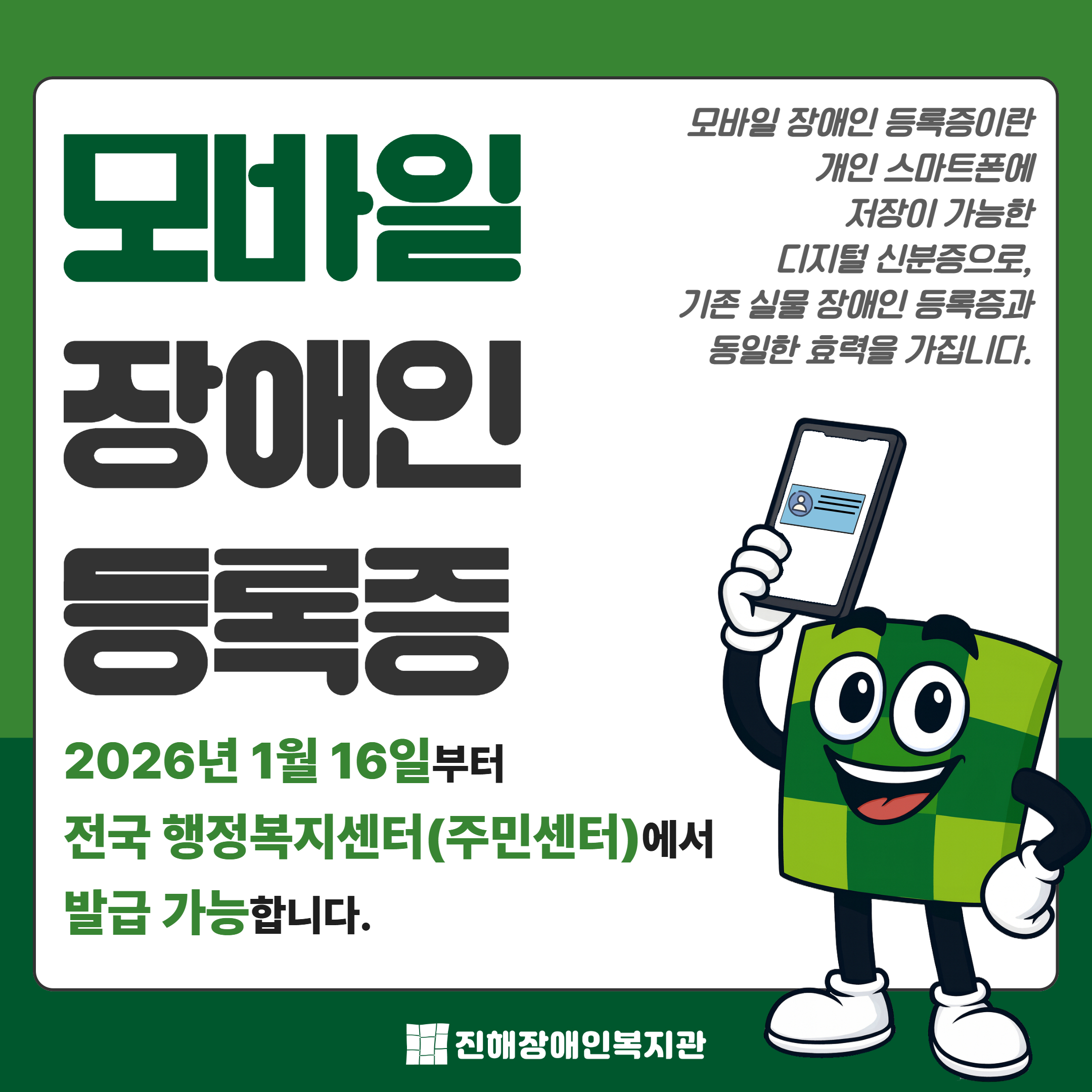 1. 2026년 1월 16일부터 전국 행정복지센터(주민센터)에서 발급 가능합니다.2. 14세 이상 장애인 중 자신의 이름으로 가입한 핸드폰을 가지고 있어야 해요.(14세~18세, 지적, 자폐성, 정신장애 중 1개라도 해당 된다면 보호자(법적대리인)의 동의가 필요해요.) 3. 현재 사용하고 있는 복지카드나 주민등록증이 필요해요.(사진이 지금 얼굴과 많이 다르...
