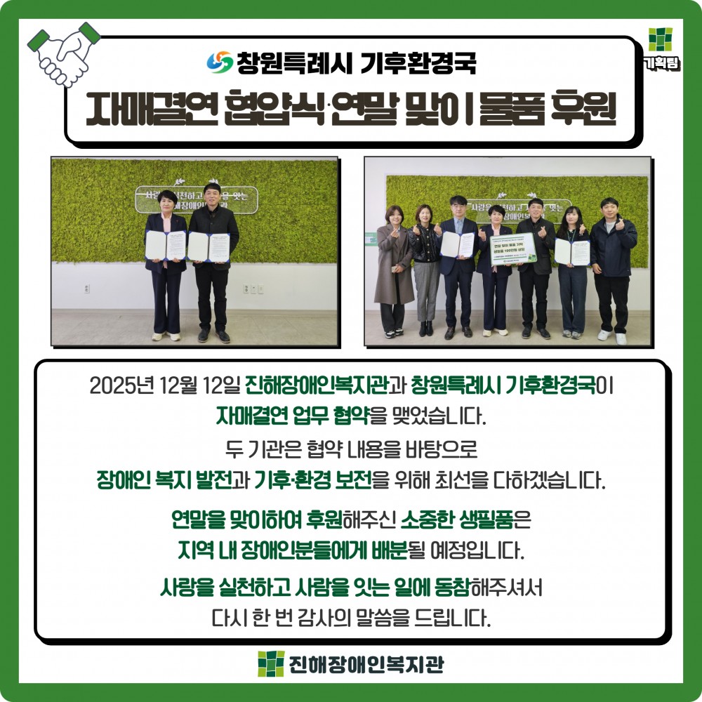 2025년 12월 12일 진해장애인복지관과 창원특례시 기후환경국이 자매결연 업무 협약을 맺었습니다.