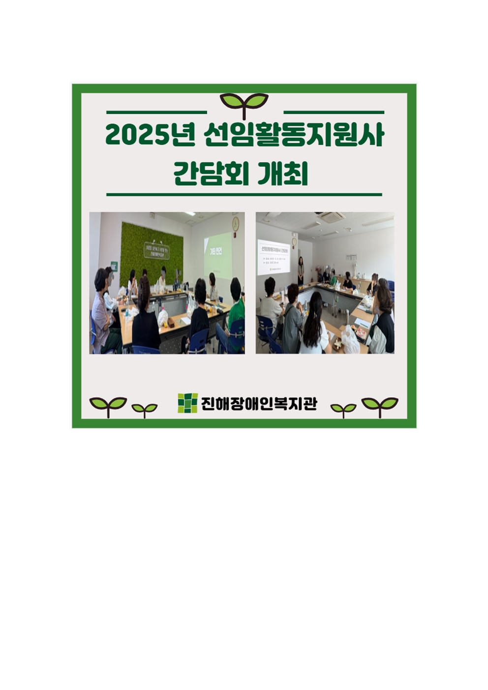 2025년 9월 23일 화요일 오전 11시에 2025년 선임활동지원사 간담회를 개최하였습니다. 신규활동지원사의 빠른 정착을 지원하고 체계적인 현장실습 지도를 위해 공통된 메뉴얼을 공유하기 위한 자리였습니다. 이 간담회를 통해 선임활동지원사로서의 자부심과 책임감도 높일 수 있었습니다. 현장실습에 동의해 주신 이용자분께도 감사드립니다.