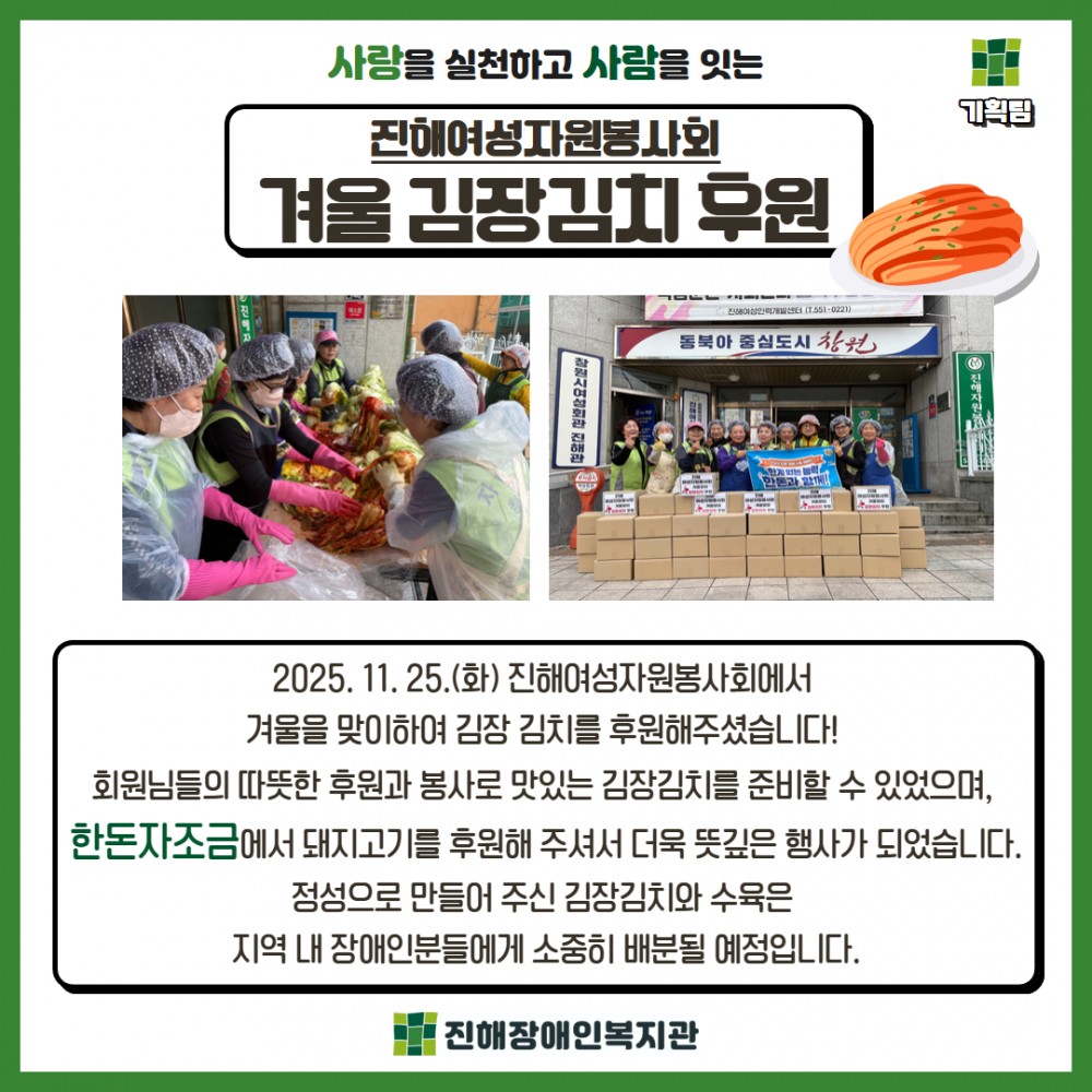 페이지 정보 작성자 박민우 댓글 0건 조회 35회 작성일 25-11-26 11:07 목록 본문 2025 2025년 진해여성자원봉사회 겨울 김장김치 후원 감사합니다. 이전글2025년 루비라이온스 겨울 김장김치 후원 25.11.26 다음글진해장애인복지관 2025년 10월 뉴스레터 25.11.24 목록