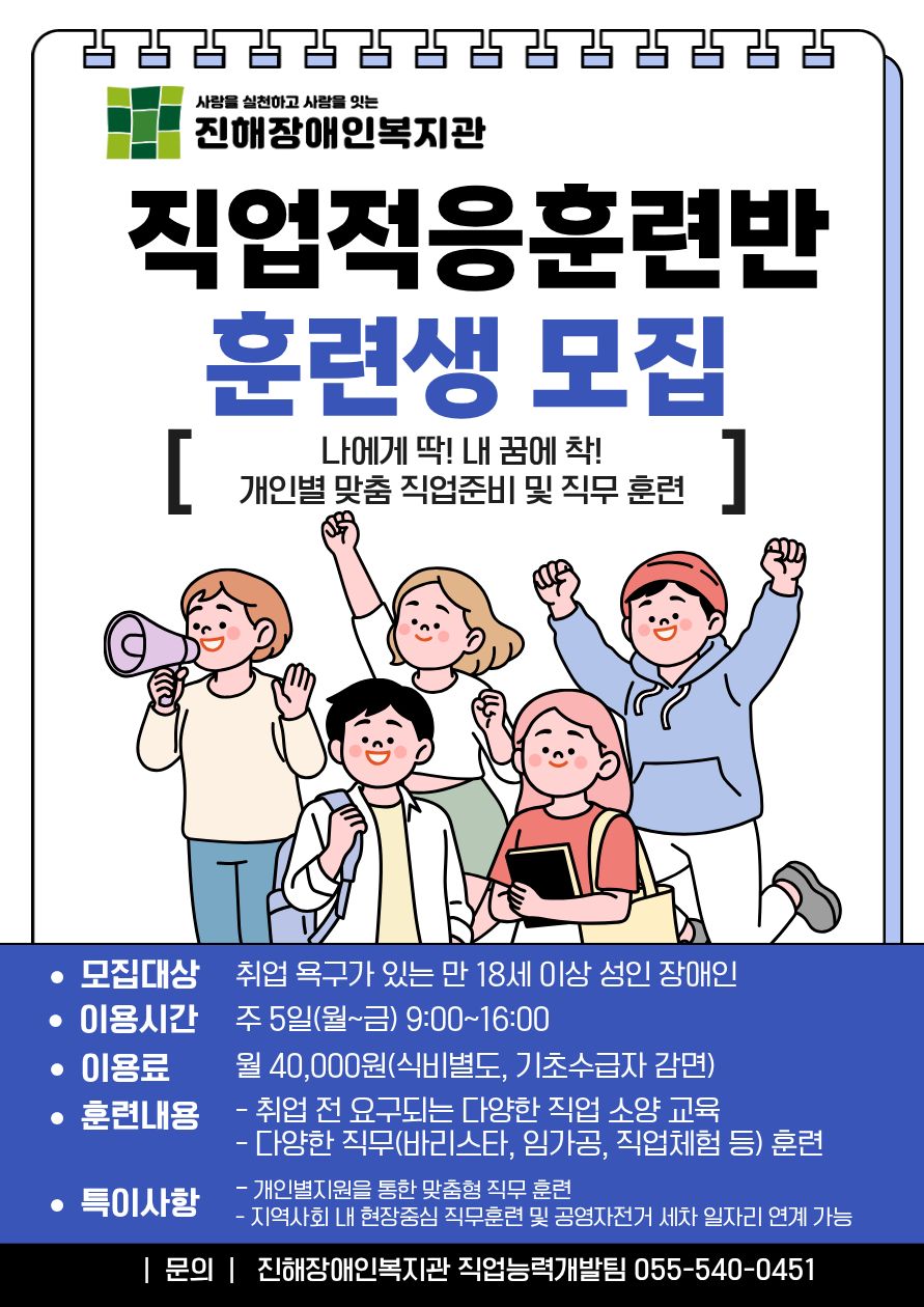 페이지 정보 작성자 직업능력개발팀 댓글 0건 조회 40회 작성일 26-04-03 16:42 목록 본문 직업능력개발팀 직업적응훈련생 모집 직업능력개발팀 직업적응훈련생을 모집합니다. 직업적응훈련에 관심있으신 분은 연락부탁드립니다. 감사합니다. 다음글2026년 편의시설 조사 공모전 26.03.26 목록